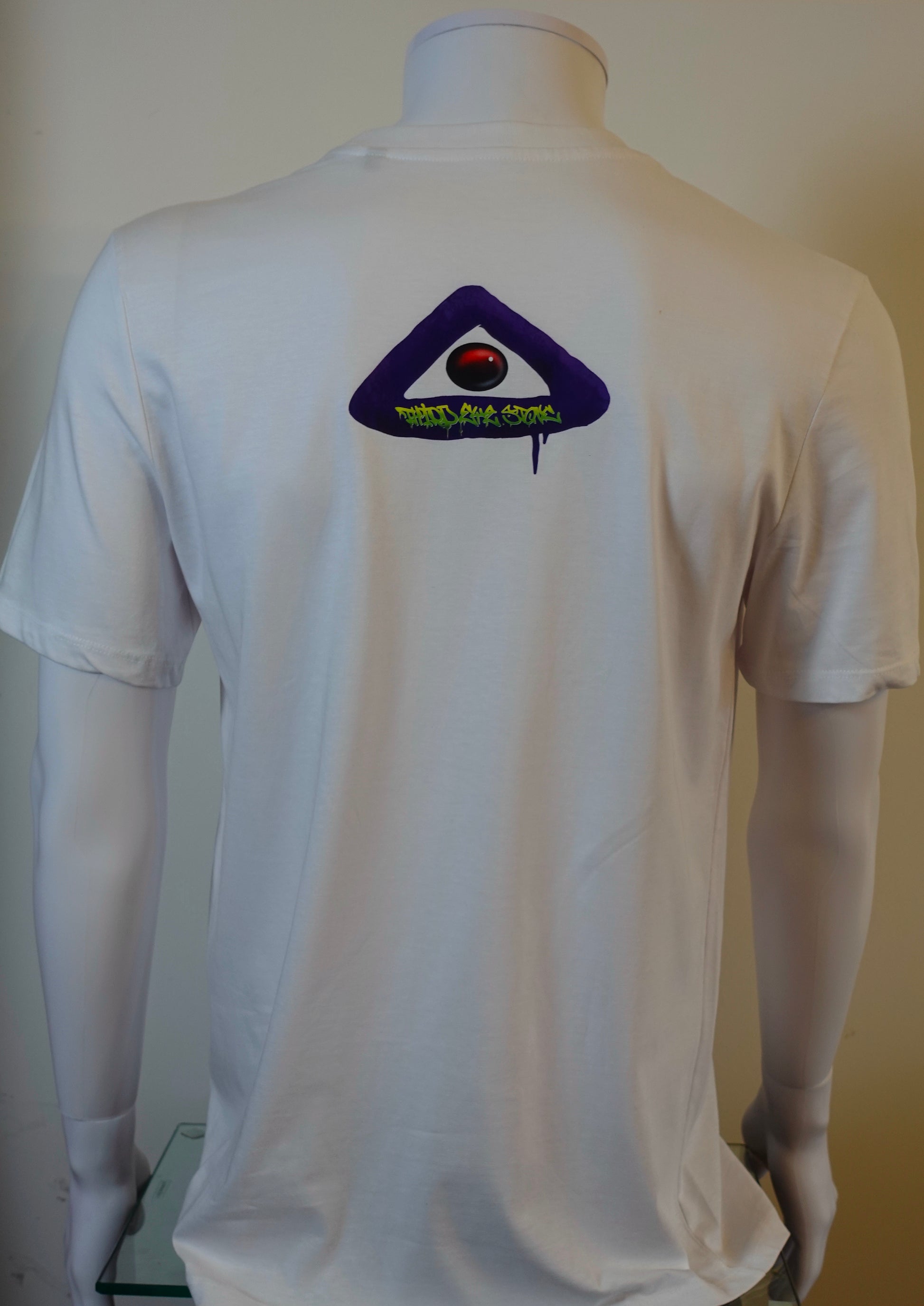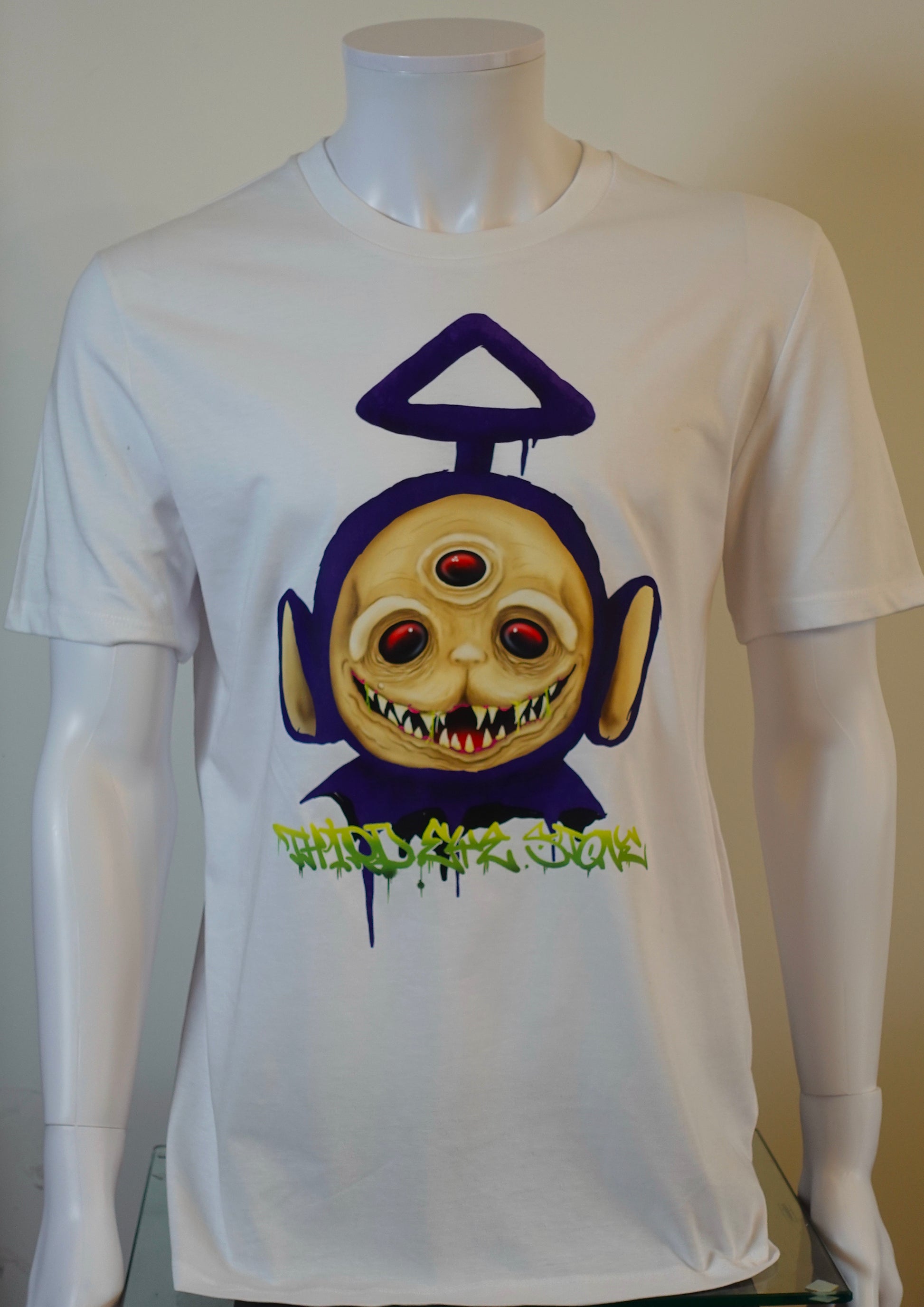 tee-shirt blanc, impression devant et derrière en couleur, avec un dessin original représentant Tinky winky après des années d’errance et une ouverture sur son troisième oeil