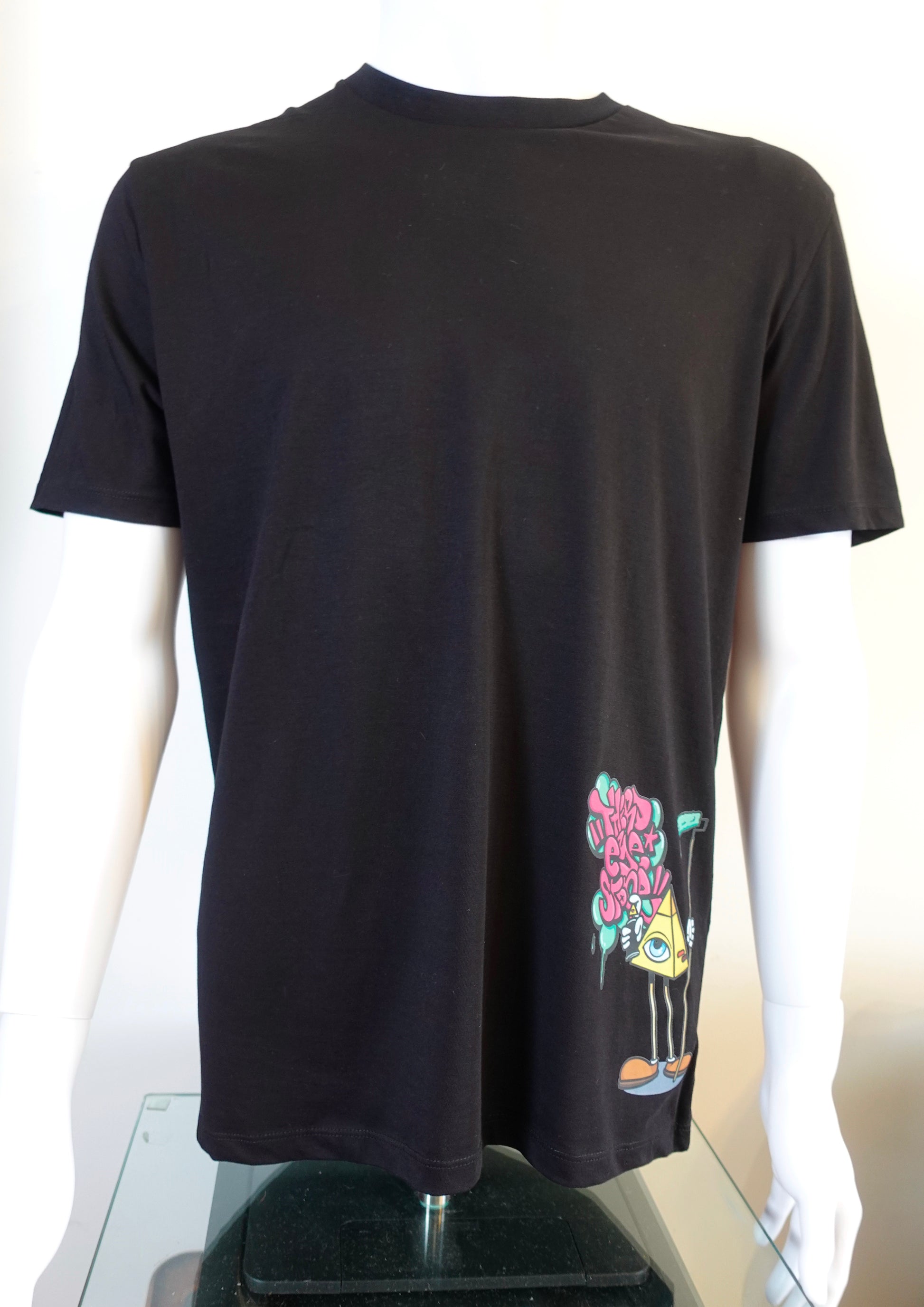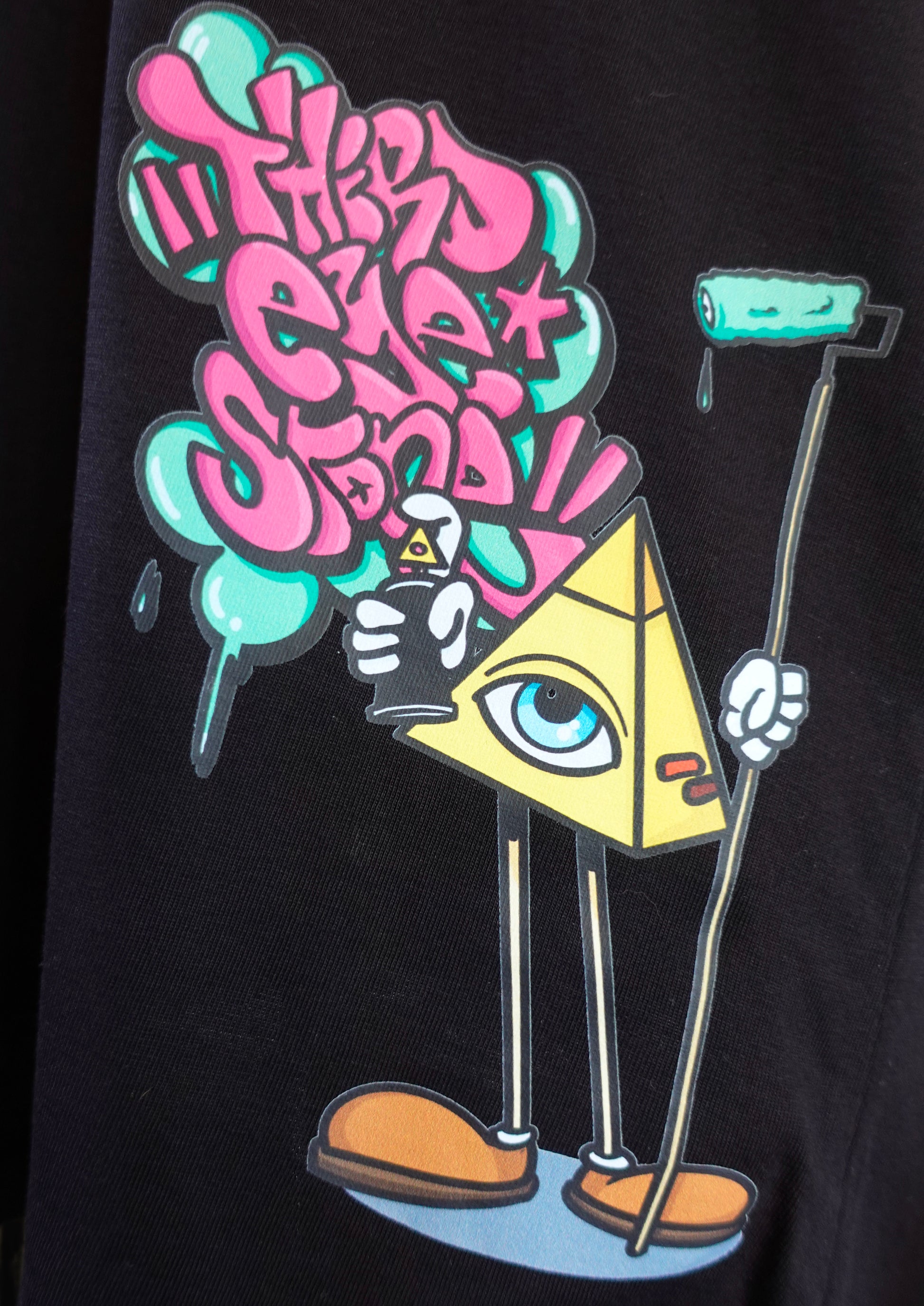 tee-shirt noir, impression devant et derrière en couleur, avec un dessin original représentant une pyramide sur ses longues jambes contemplant son œuvre