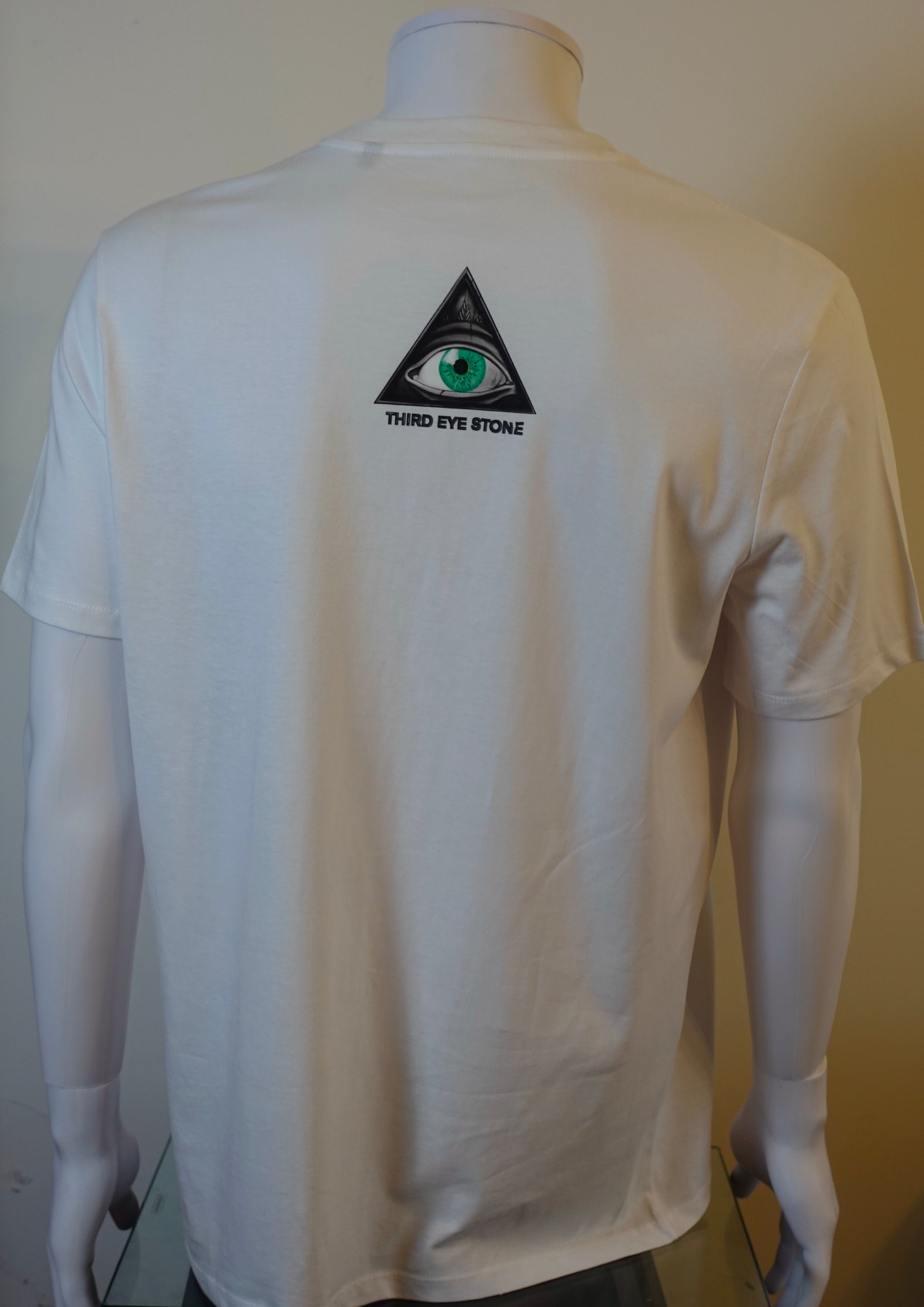 tee-shirt blanc, impression devant et derrière en couleur, avec un dessin original représentant un hommage aux films d’extraterrestres avec leurs monstres tentaculaires qui venaient envahir la planète